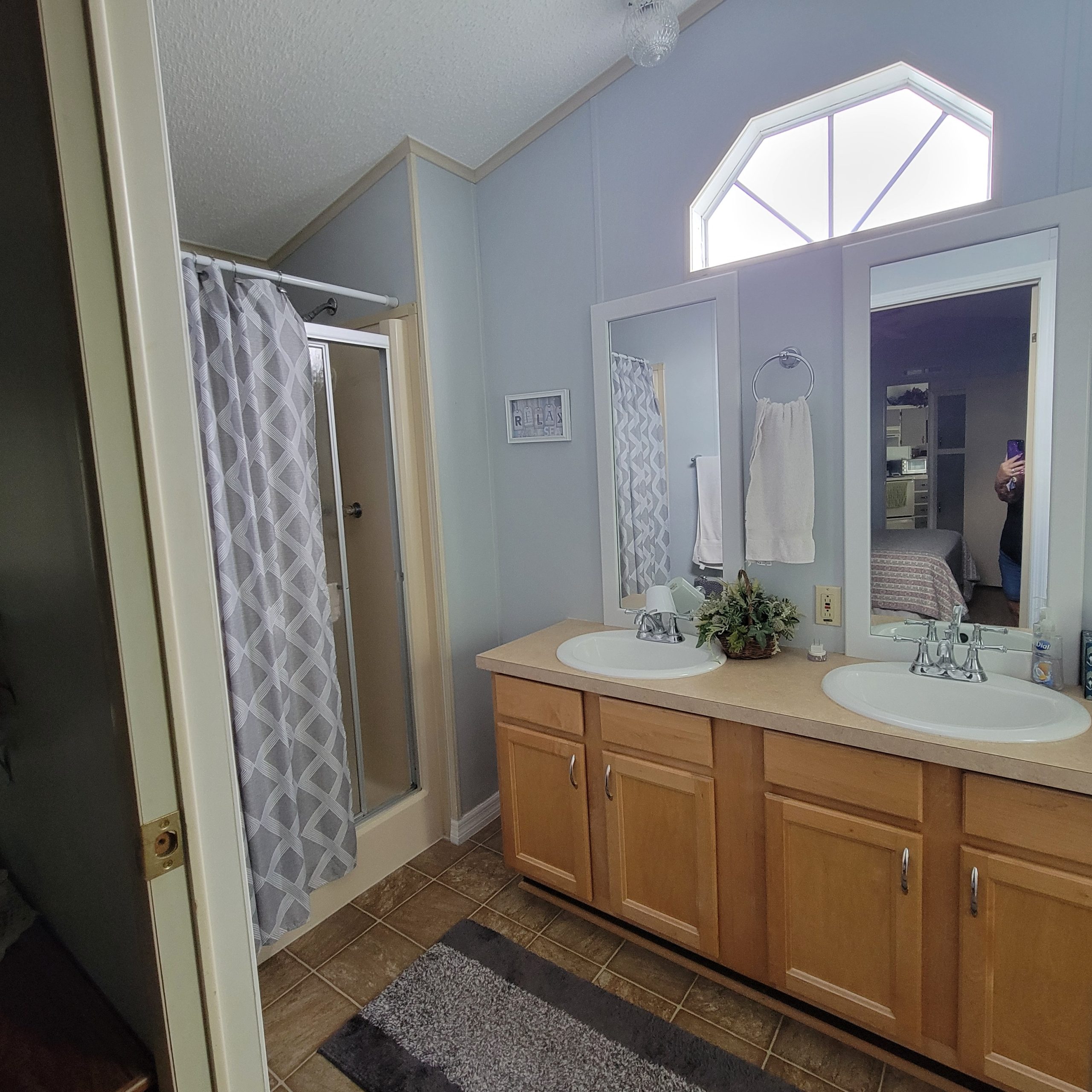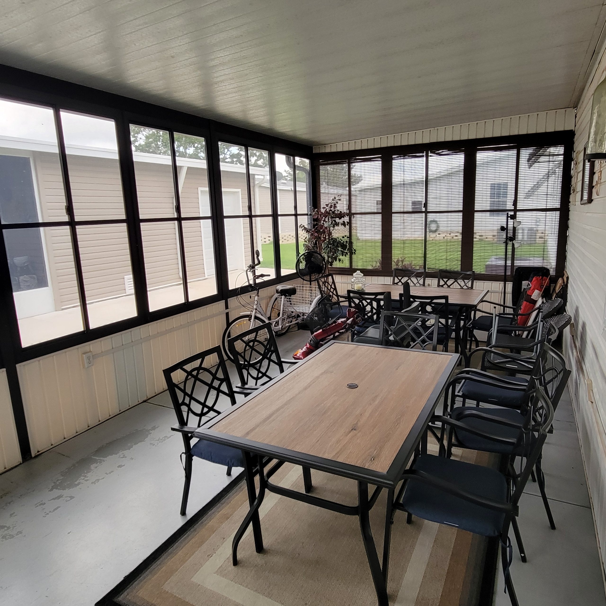Singlewide mobile home with a screened-in porch to enjoy the beautiful weather. Driveway and walkways are done in matching decorative concrete.